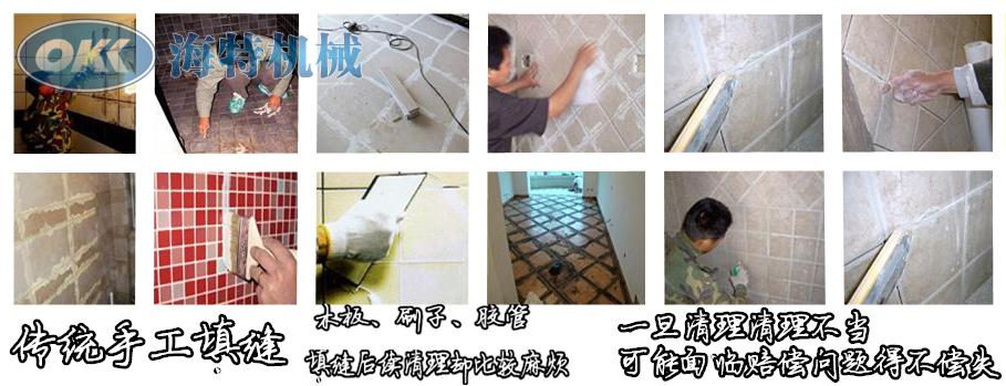 而 在這些縫隙中填入粘結(jié)劑成為填縫,傳統(tǒng)填縫方式則是采用人工用木條、鐵板甚至用手,小量的將粘結(jié)劑慢慢填補(bǔ)縫隙,或者大面積抹涂后再針對(duì)縫隙大小,用鐵線 對(duì)準(zhǔn)縫隙慢慢壓平粘結(jié)劑,等待物料干結(jié)后再清洗磚面,遇到光滑面磚可以清洗干凈,如磚面是亞光或者不平整文化磚,則無法清洗,造成施工賠償?shù)燃m紛。